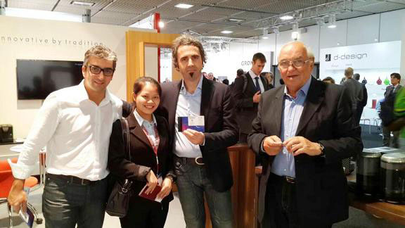 2013年9月份,我和歐總參加了德國IFA展會(歐洲的電子展),在展會上,前兩天我們漫無目的的參觀著,結(jié)果連客戶的名片都沒要到。一想到我們這次來的目的是為了尋找客戶的,后面我鼓足了勇氣開始跟陌生人交流,終于要到了幾十張客戶的名片,其中就有IFFPER SPA的設(shè)計師和老總的,而且跟他們聊得挺投緣的,并且在展會上合影了。