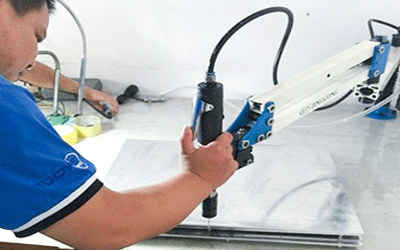 將程序語(yǔ)言輸入到計(jì)算機(jī)當(dāng)中,通過程序的命令進(jìn)行精確的加工,CNC加工中心上面的刀具按照設(shè)定的路徑在鋁合金材料上運(yùn)動(dòng),從而鑼出手板的雛形。